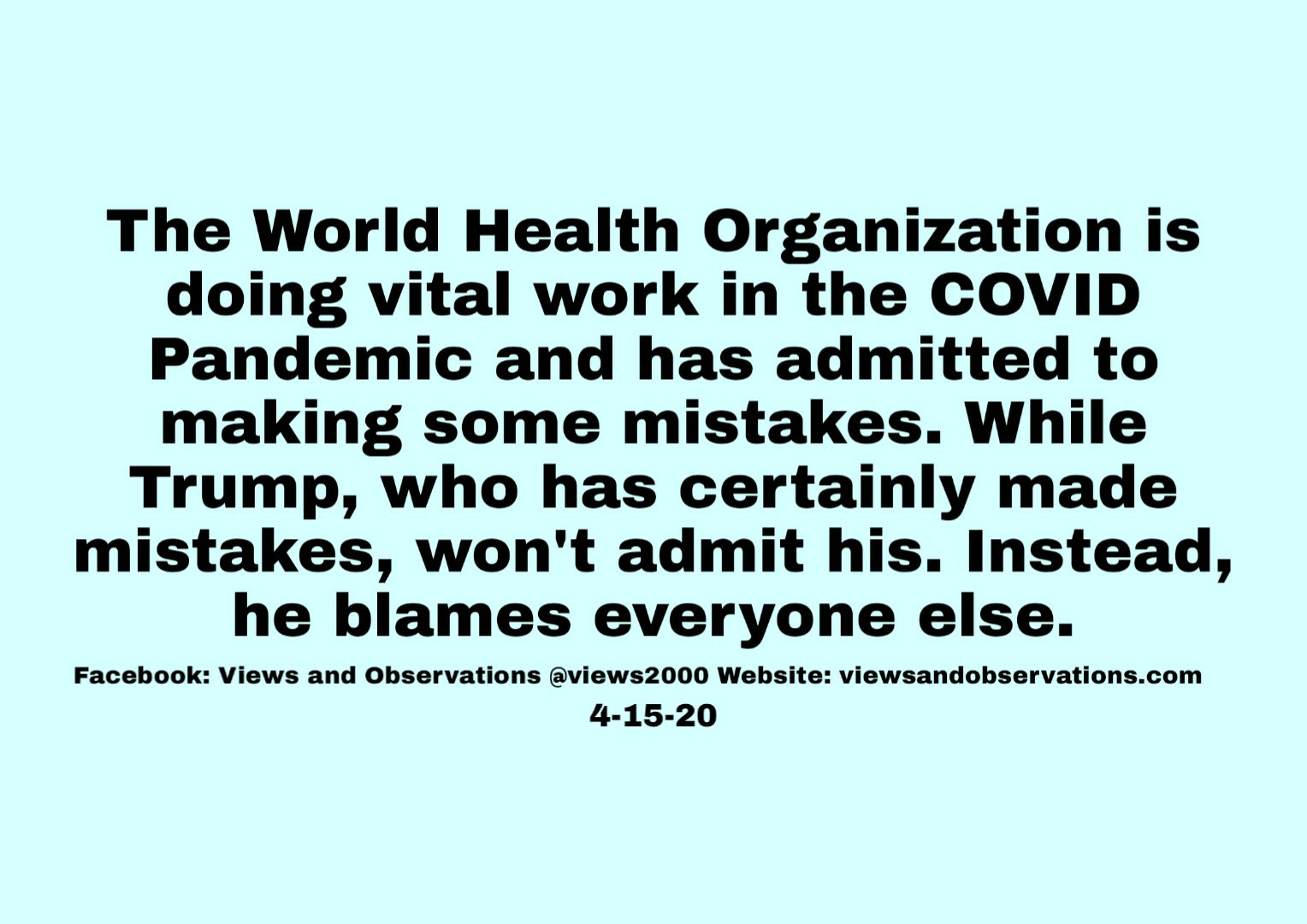 A major difference between WHO and Trump is that Trump is not acknowledging his mistakes. Instead, he is blaming others. This sort of behavior is dangerously immature, counterproductive, and hurtful. It negatively impacts the battle against COVID by creating unnecessary divisions while potentially decreasing WHO’s ability to function as it needs to.