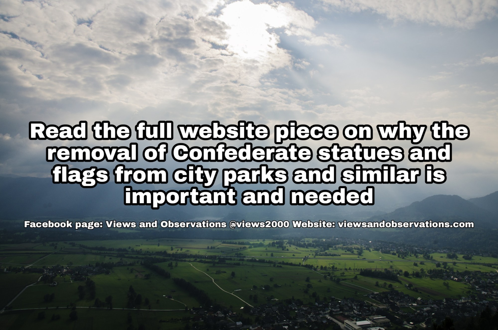 Now, think about this: statues in city parks should honor people, movements, or organizations that the majority of the current population can agree deserve such treatment. Considering this country’s history, that is certainly not Confederate soldiers or the Confederate flag.