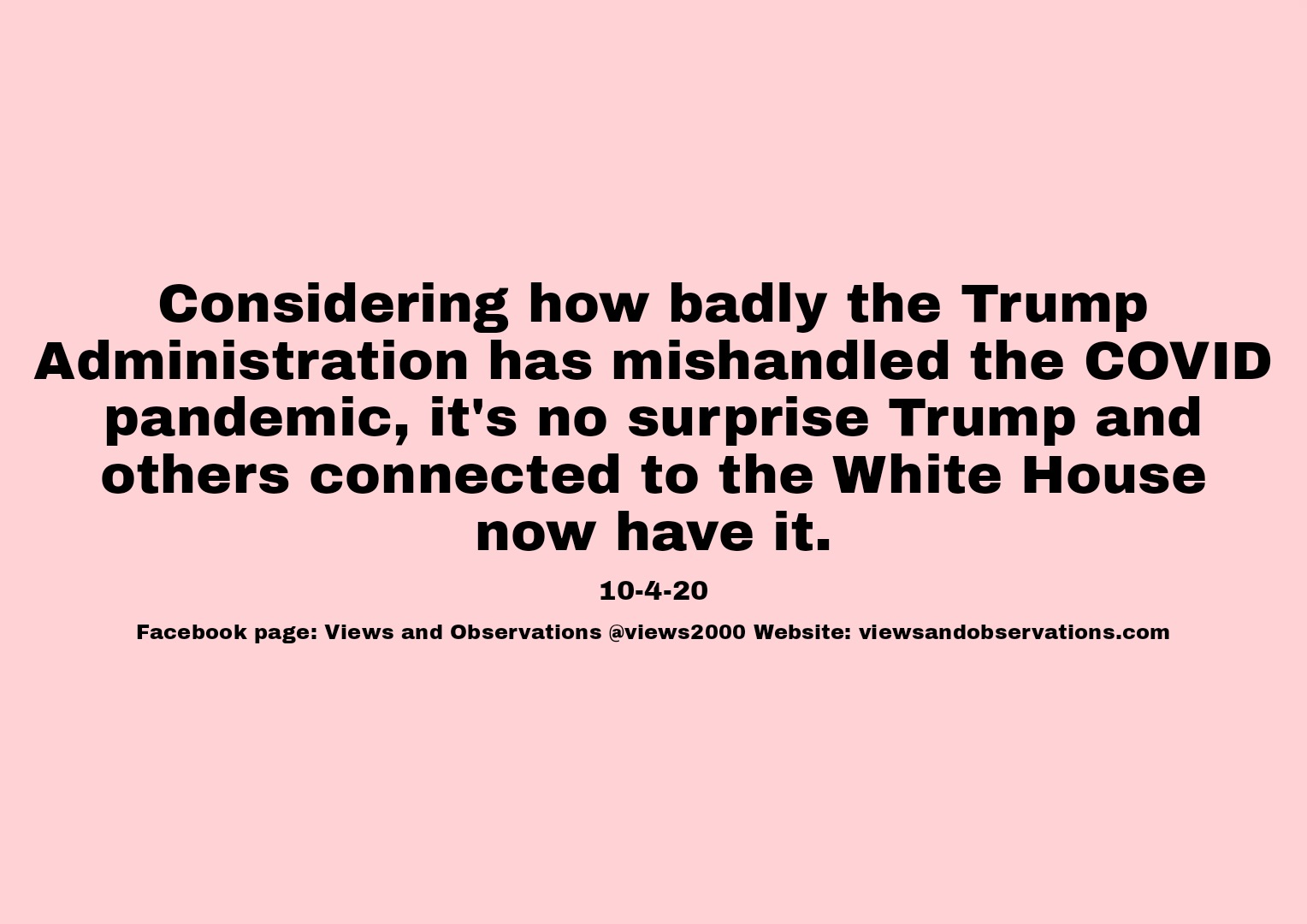 Thus, it is of no surprise that Trump, Melania, and others who attended the Rose Garden event now have COVID 19. The gross mishandling by the Trump Administration of the COVID pandemic led to this as well as unnecessary suffering and loss of life for people all across this nation.