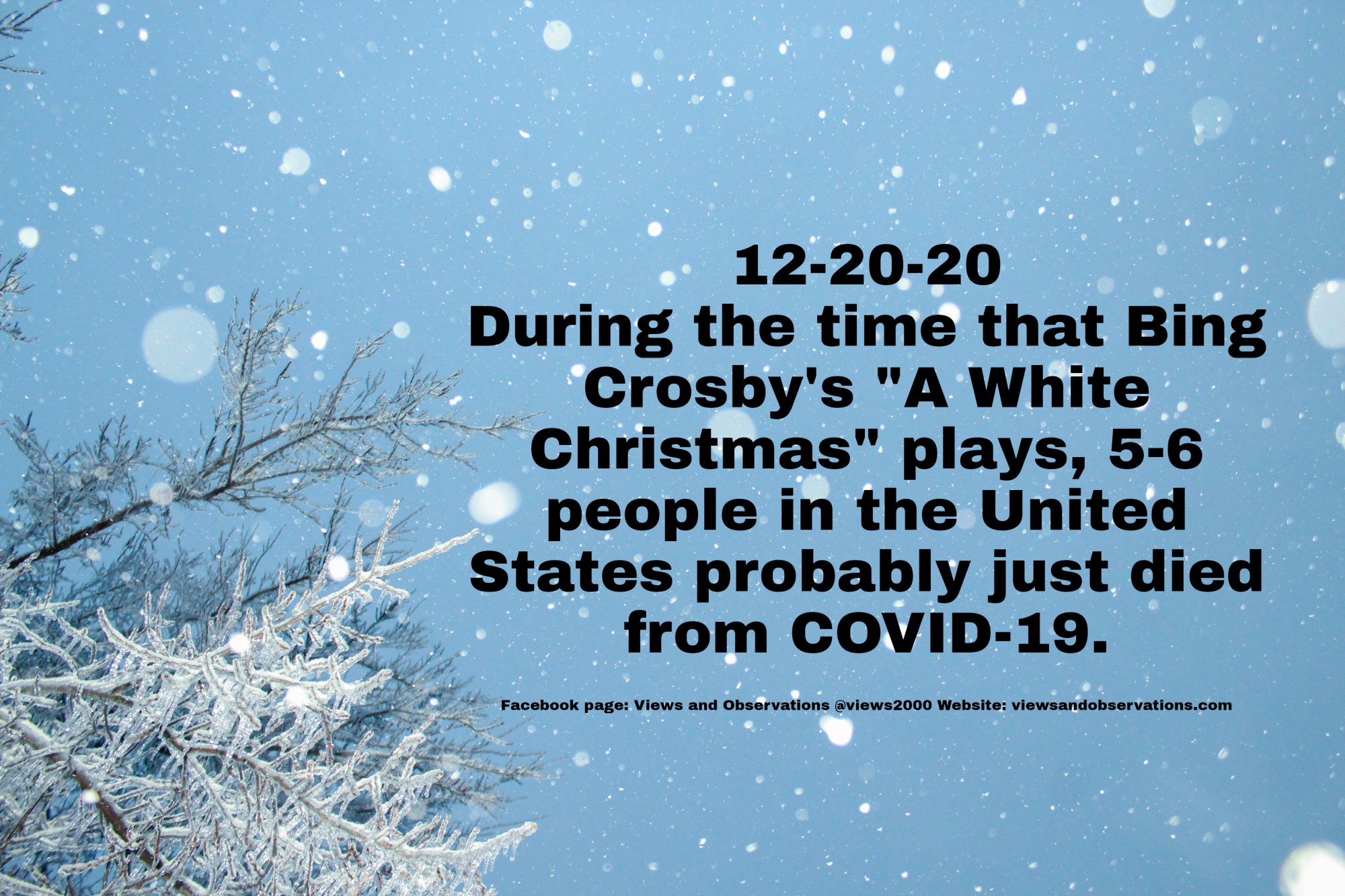 Think about that: every 30 seconds, a human being dies of COVID-19 in the United States. Putting it in these terms: when you listen to Bing Crosby’s “A White Christmas,” odds are that 5-6 people just died of COVID in the United States.