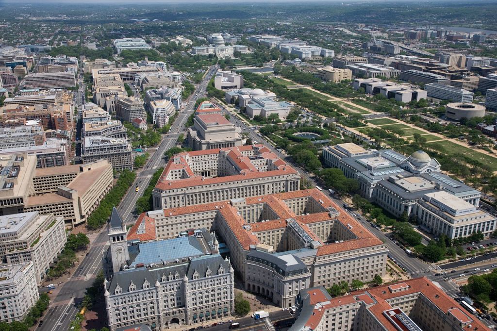 Just east/southeast of the White House between Pennsylvania Avenue, Constitution Avenue, and 15th Street NW are the impressive, neoclassical buildings that make up the formidably large Federal Triangle complex. These grand structures are full of offices where people work throughout the week keeping the bureaucracy of government churning along. Next to the office buildings is the stunning columned National Archives.