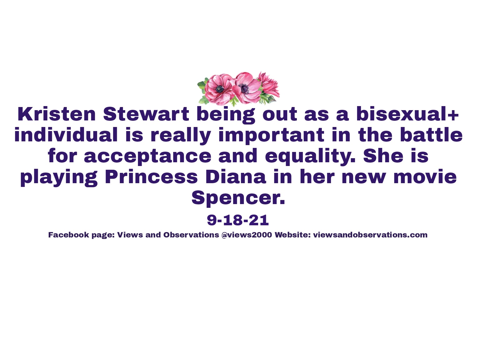 There’s been quite a bit of buzz about bisexual+ actress Kristen Stewart’s new movie Spencer in which she plays Princess Diana. From the photos I’ve seen, it looks like Stewart really got into the part as she attempted to recreate the tragic and beloved Royal. It also sounds like numerous critics are giving her very positive reviews with some even speculating on a potential Oscar nomination. At least one reviewer felt like Stewart really captured how Diana didn’t fit in well with the traditional rather stoic, stiff upper lip Royals. Since I haven’t seen the film yet, it’s obviously difficult for me to say if I agree with them, but I could definitely see Kristen Stewart potentially nailing this role.