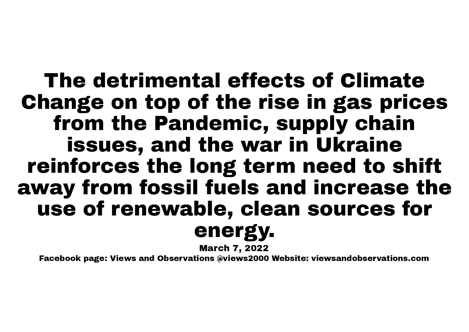 The rise in petroleum prices that we are seeing these days reinforces the need for the United States and other countries to speed up the shift to renewable, clean energy. Supply chain issues, the COVID Pandemic, and now Russia’s brutal invasion of Ukraine are all playing roles in the current rise of gas prices (and inflation) which we’re seeing around the world.