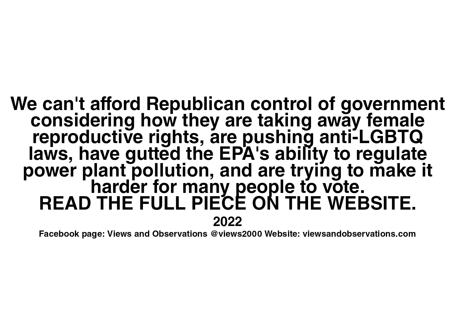 The brutal reality is that we can’t afford Republican control over governments these days (local, state, or federal) because they are going too far as they try to legislate things (many of which come from their personal religious beliefs) upon the entire population even when the majority disagrees with them. They are literally attacking the rights of millions upon millions of people (such as with anti-LGBTQ laws and abortion bans) that will increase the suffering of many and will lead to a significantly increased number of tragic, unnecessary deaths (like from suicide of LGBTQ youth).