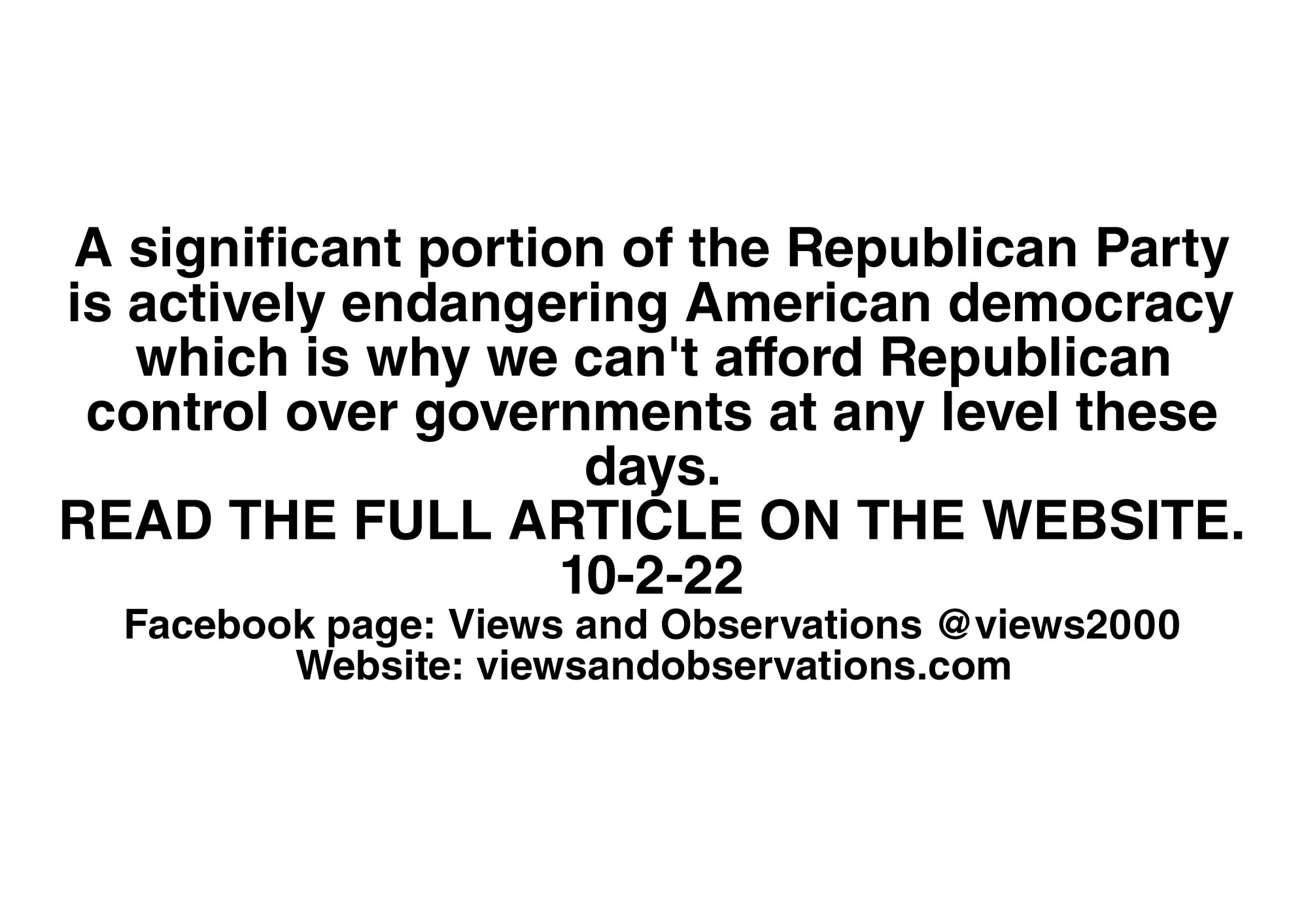 In many ways, the Republican Party is now the party of Trump, a party that is willingly following a narcissistic, lying authoritarian figure. Despite the fact that overwhelming evidence shows the 2020 election was fair and that Joe Biden legitimately won, the majority of Republicans believe Trump’s lies instead. And a significant percentage are actively promoting those lies. Many Republicans have gone so far as to push for laws and policies that are clearly undemocratic. Want some examples? Here you go: In several states, Republicans have proposed bills that would allow state legislatures to overturn election results and allot electoral votes themselves, literally ignoring the will of the voters. There are also proposals by Republicans that would make it very difficult for election officials to deal with partisan poll watchers who are intimidating and interfering with voters and election workers. Republicans in numerous states are also trying to get Trump following election deniers into positions (like secretary of state) where they would oversee future elections, thus increasing their ability to interfere with (and possibly overturn) legitimate election results they don’t like. These are not exaggerations. Mail in voting is another target Republicans are aiming at despite the fact that it has been shown to be very secure and effective. The blunt reality is that Republicans are going after it because Democrats were the main ones who used mail in voting in the 2020 election. Again, I’m not exaggerating here. I wish I was, but I’m not. This is really happening.