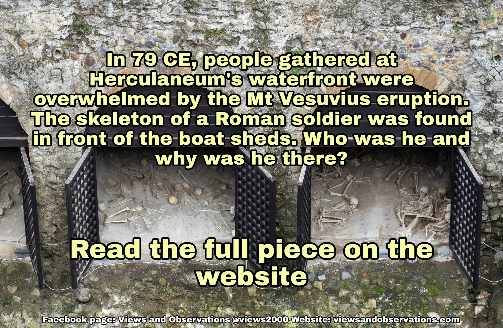 Herculaneum was not known to have had a large military presence or bases as far as experts understand. The town had a population of probably around 4000 to 5000. Being on the water, there would have people who made their living fishing in addition to others working in various jobs such as running thermopolia (fast food type places), bath houses, brothels, and so on. It was also likely a resort town for the rich who had villas there so that in addition to fishing and merchant boats being present on the waterfront, there would have been pleasure craft as well. Knowing this, one wonders about why the soldier was there.