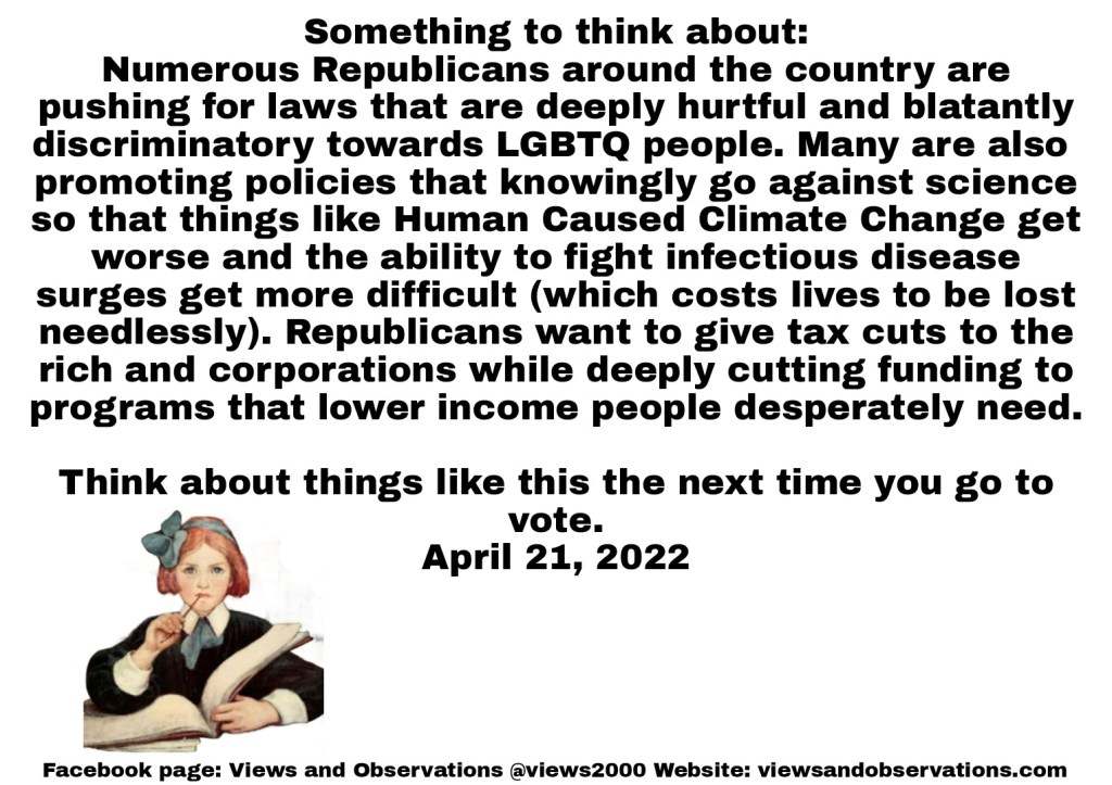 There are other disturbing trends emanating from the Republican Party. One is the way many Republicans continue to deny human-caused climate change and often promote the use of fossil fuels despite the fact that this worsens the climate change crisis the planet currently finds itself in. This is also very narrow-minded economically because the future is not in fossil fuels but in renewable energy instead. Another sickening trend is the way the Republican Party in many states is attacking the Transgender Community, particularly Transgender kids. These attacks are extremely harmful to innocent Transgender people and increase the likelihood that some may take their own lives.